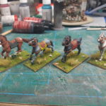 Mais du coup, je me suis lancé dans la peinture d’une bande de Normands, dont voici un premier point, 4 gardes. C’est très, TRÈS, basique, et pas particulièrement soigné, mais ça fait son effet sur une table, et c’est tout ce que je leur demande.