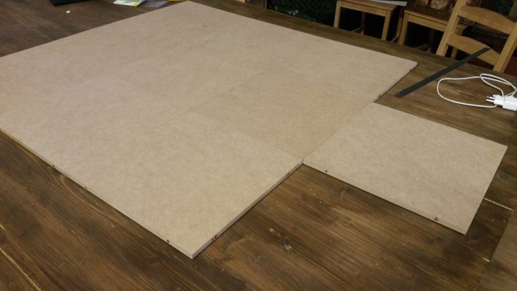 Et en voyant une de leur vidéo expliquant comment les coller sur des planches en bois pour les rigidifier, ça m’a donné l’impulsion pour mettre en pratique un projet que j’avais en tête depuis quelques temps, faire un terrain modulaire avec des tuiles magnétiques. Les superbes tuiles de « Manorhouse Workshop » viendront se coller dessus quand je les recevrai.